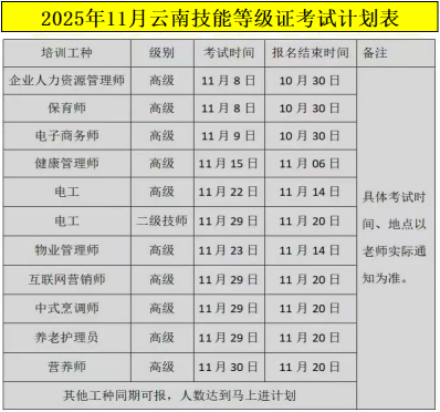 职业技能等级证:电工中级/高级/二级技师、物业管理师、企业人力资源管理师、健康管理师、保育师、仓储管理员、电子商务师、茶艺师、公共营养师、养老护理员、职业培训师、婴幼儿发展引导员、互联网营销师、中式烹调师、园林绿化工等每月开班,随报随学,2025年11月开班计划表如下: