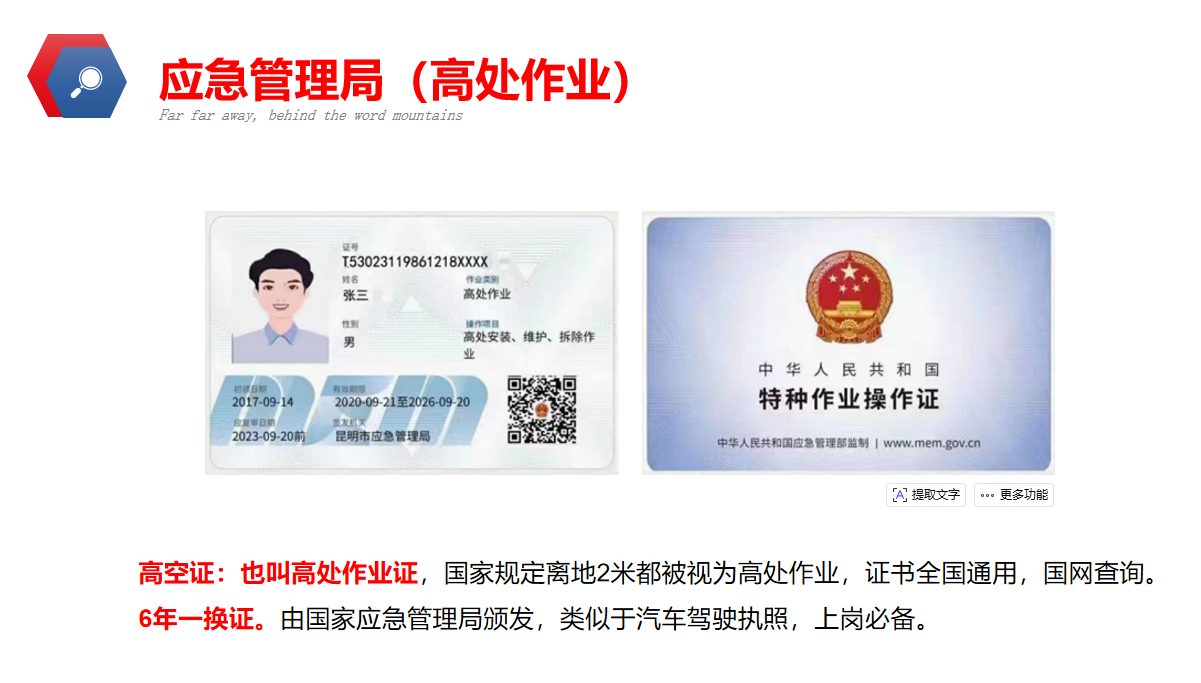 高处安装、维护、拆除作业(高处作业):指在高处从事安装、维护、拆除的作业。适用于利用专用设备进行建筑物内外装饰、清洁、装修,电力、电信等线路架设,高处管道架设,小型空调高处安装、维修,各种设备设施与户外广告设施的安装、检修、维护以及在高处从事建筑物、设备设施拆除作业。报考咨询电话:18184888595王老师
