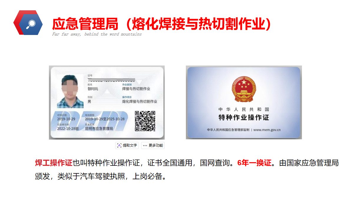 发证机关:应急管理局(原来的安监局),6年一换证,证书国网可查,全国通用,上岗必备。报名后由学校统一组织培训,培训完统一组织到应急管理局安全生产考试点考试,理论、实操成绩合格后,由发证机关制证后方可取得。 第一、报名:提交资料报名,开通线上学习平台; 第二、参加线下培训:线上课程学完后参加线下培训; 第三、参加考试:理论和实操考试,及格分数为80分; 第四、拿证:考试通过后两周左右查询和下载证书。 《特种作业人员安全技术培训考核管理规定》第四条规定,特种作业人员应当符合下列条件: 1.年满18周岁,且不超过国家法定退休年龄; 2.无妨碍从事相应特种作业的器质性心脏病、癫痫病、美尼尔氏症、眩晕症、癔病、震颤麻痹症、精神病、痴呆症以及其他疾病和生理缺陷(根据《中华人民共和国应急管理部公告》(2018年第12号),申请办理特种作业操作证时,申请人不再提交体检证明,改为个人健康书面承诺); 3.具有初中及以上文化程度(危险化学品、煤矿特种作业人员应当具备高中及以上文化程度); 4.具备必要的安全技术知识与技能; 5.相应特种作业规定的其他条件。 1、身份证正反面照片 2、初中或初中以上毕业证照片(没毕业证的提供户口本本人页照片) 3、电子版白底照片 4、个人健康承诺书(本人签字按手印) 5、特种作业人员取证申请表(本人签字按手印) 承诺书、申请表模板联系王老师获取:18184888595