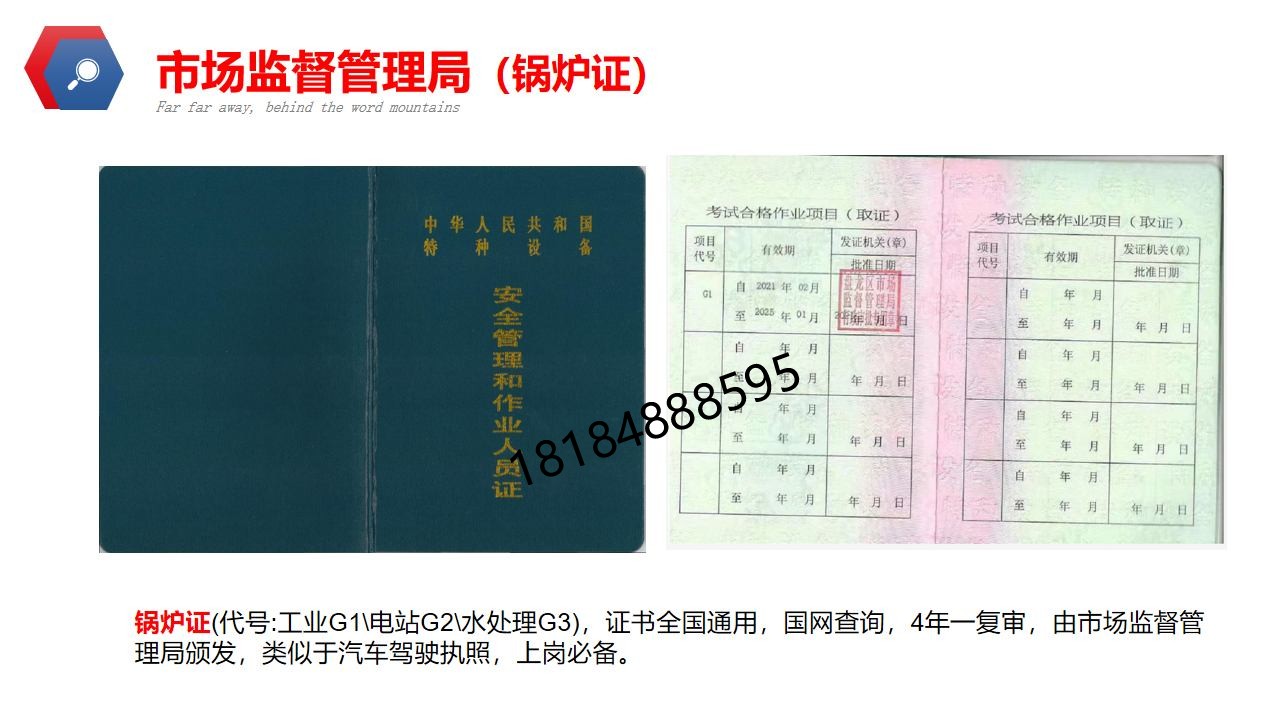 锅炉证(代号:G1\G2\G3),证书全国通用,国网查询。4年一复审。由市场监督管理局颁发,类似于汽车驾驶执照,上岗必备。